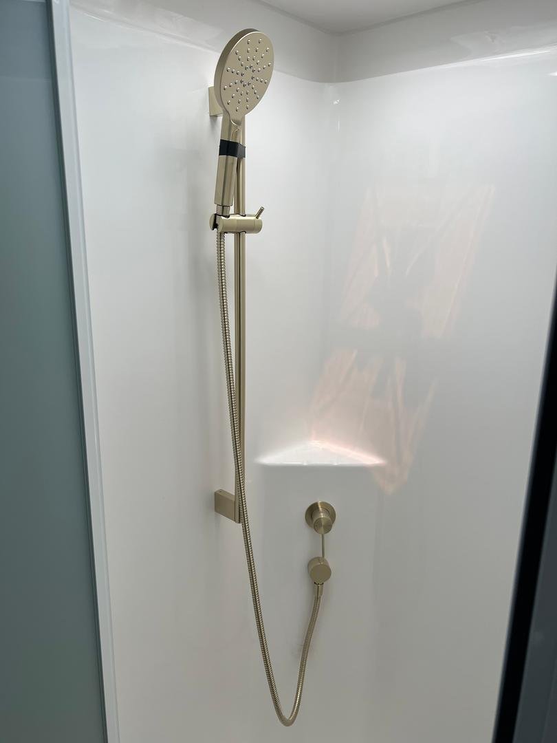 - Large one-piece shower capitular with gold fittings
